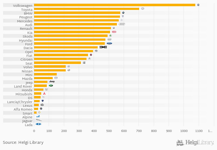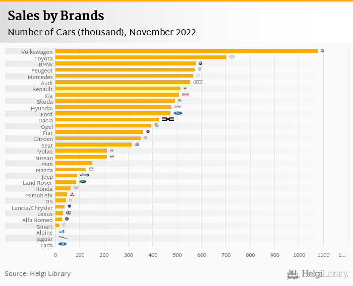 In terms of particular brands, Volkswagen stands out as the most favorite brand accounting for 1,079 thousand sold vehicles, or 10.6% of all new passenger cars sold on the European market in November 2022. In terms of momentum, Toyota gained the most in terms of market share in the first month of the year 2022 (up 0.834 bp) followed by Kia and Audi. Peugeot and Citroen were on the other end of the market spectrum losing -0.500 bp and -0.391 bp respectively.