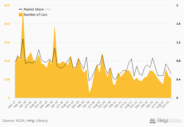 In November, most vehicles (261 thousand) were sold in Germany (up 31.4% yoy), followed by the United Kingdom (143 thousand, up 23.5%), France with 134 thousand cars (up 9.81%), 120 thousand new vehicles were registered in Italy (up 14.7%) and 73.2 thousand in Spain (up 10.3%). The five largest countries accounted for 64.8% of total new vehicles registered in November 2022.