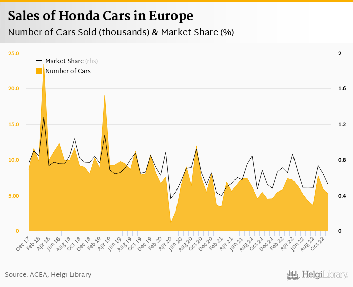 Honda sold 5.22 thousand new passenger cars representing a 0.514% share of all new passenger cars sold in Europe in November 2022. This is 15.7% more vehicles and a 0.008 pp decrease in market share when compared to last year. Compared to three years ago, Honda's market share is now 0.146 pp lower.