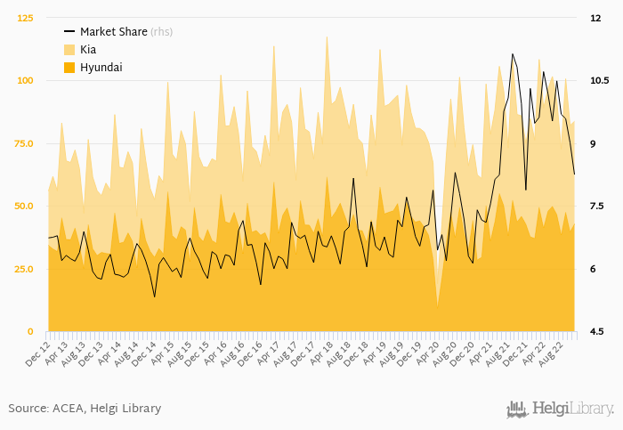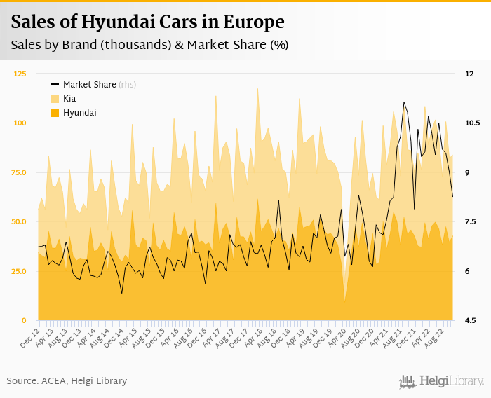 Hyundai Group sold 83.7 thousand new passenger cars representing a 8.25% share of all new passenger cars sold in Europe in November 2022. This is 2.56% fewer vehicles and a 1.69 pp decrease in market share when compared to last year. Compared to three years ago, Hyundai Group's market share is now 1.48 pp higher.