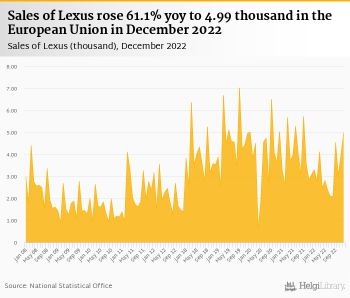 Sales of Lexus rose 61.1% yoy to 4.99 thousand in the European Union in December 2022, according to company data. This is 24.3% more than in the previous month.