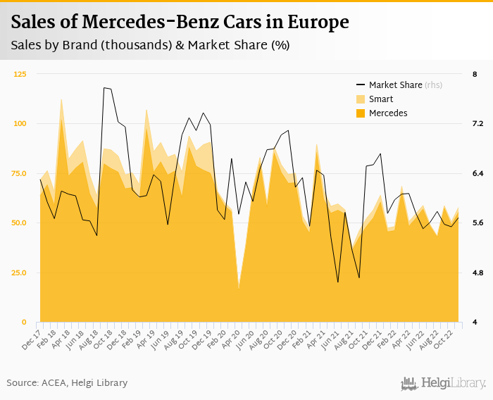Mercedes-Benz sold 57.6 thousand new passenger cars representing a 5.68% share of all new passenger cars sold in Europe in November 2022. This is 2.05% more vehicles and a 0.856 pp decrease in market share when compared to last year. By comparison, three years ago, Mercedes-Benz's market share was 7.37%.