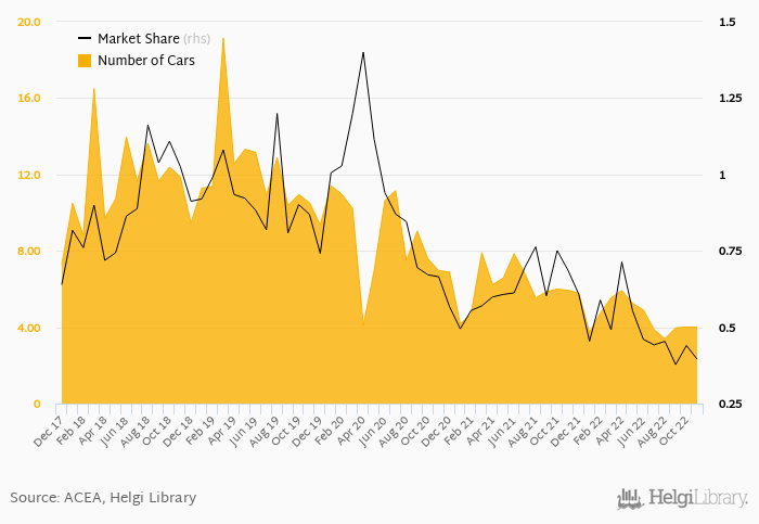 In November, most vehicles (261 thousand) were sold in Germany (up 31.4% yoy), followed by the United Kingdom (143 thousand, up 23.5%), France with 134 thousand cars (up 9.81%), 120 thousand new vehicles were registered in Italy (up 14.7%) and 73.2 thousand in Spain (up 10.3%). The five largest countries accounted for 64.8% of total new vehicles registered in November 2022.