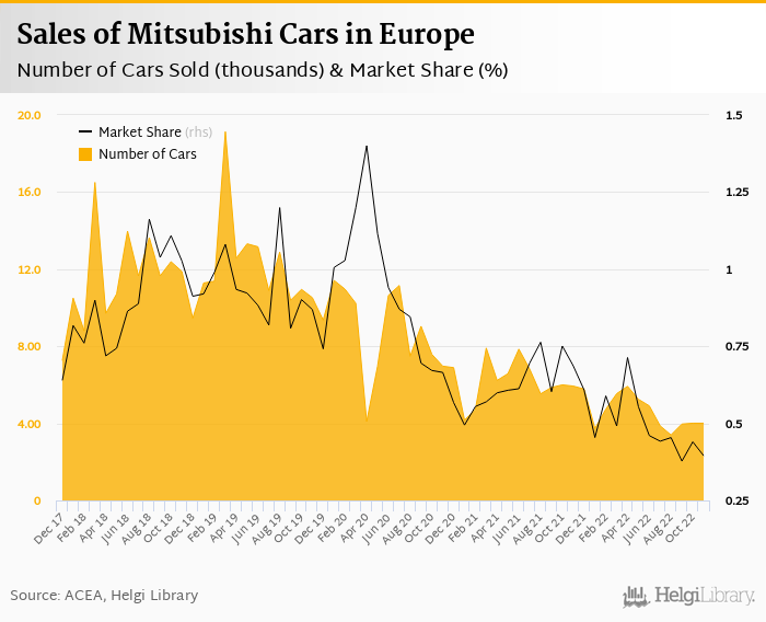 Mitsubishi sold 4.01 thousand new passenger cars representing a 0.395% share of all new passenger cars sold in Europe in November 2022. This is 32.5% fewer vehicles and a 0.292 pp decrease in market share when compared to last year. Compared to three years ago, Mitsubishi's market share is now 0.474 pp lower.
