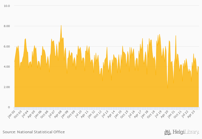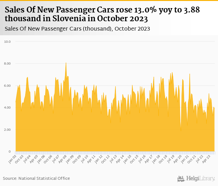 Sales of passenger cars rose 13.0% yoy to 3.88 thousand in Slovenia in October 2023, according to ACEA. This is 4.20% less than in the previous month.