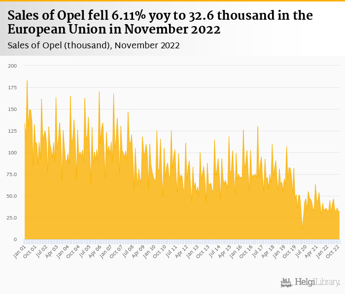 Sales of Opel fell 6.11% yoy to 32.6 thousand in the European Union in November 2022, according to company data. This is 1.60% more than in the previous month.