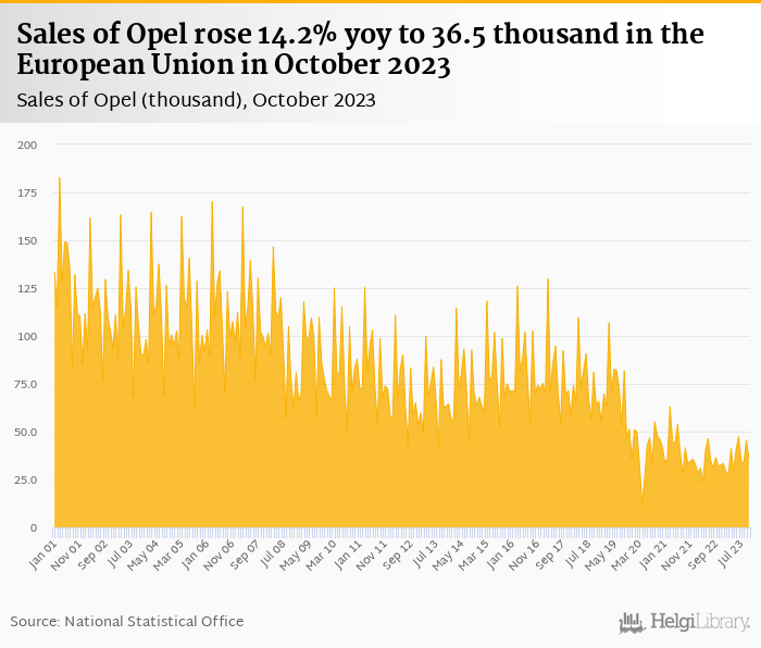 Sales of Opel rose 14.2% yoy to 36.5 thousand in the European Union in October 2023, according to company data. This is 19.5% less than in the previous month.