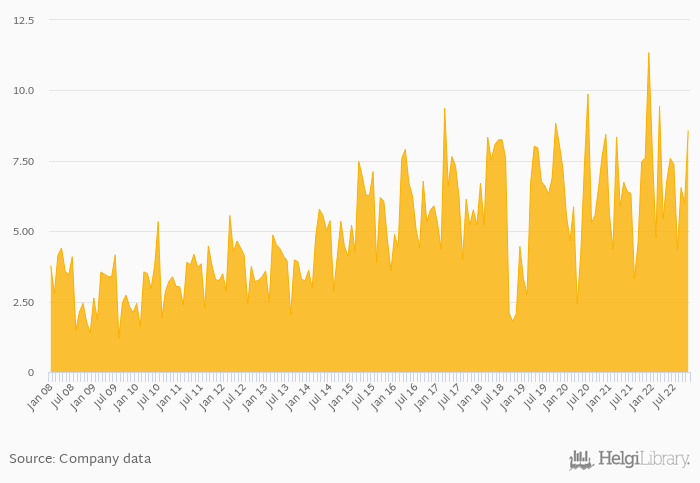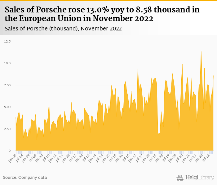Sales of Porsche rose 13.0% yoy to 8.58 thousand in the European Union in November 2022, according to company data. This is 42.9% more than in the previous month.