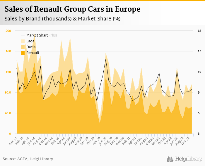 Renault Group sold 96.0 thousand new passenger cars representing a 9.46% share of all new passenger cars sold in Europe in November 2022. This is 4.24% more vehicles and a 1.20 pp decrease in market share when compared to last year. By comparison, three years ago, Renault Group's market share was 10.0%.