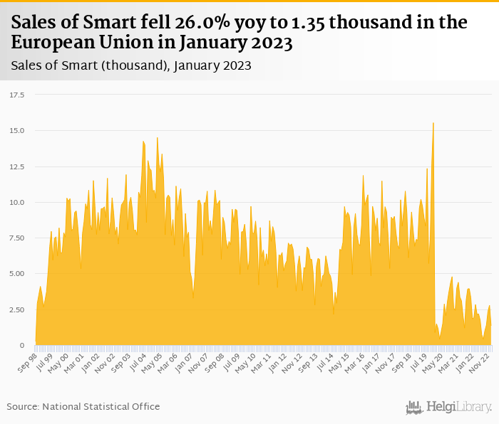 Sales of Smart fell 26.0% yoy to 1.35 thousand in the European Union in January 2023, according to company data. This is 51.6% less than in the previous month.