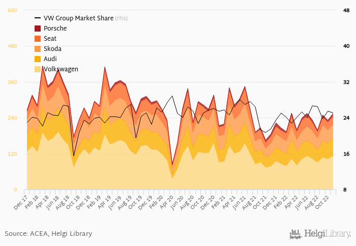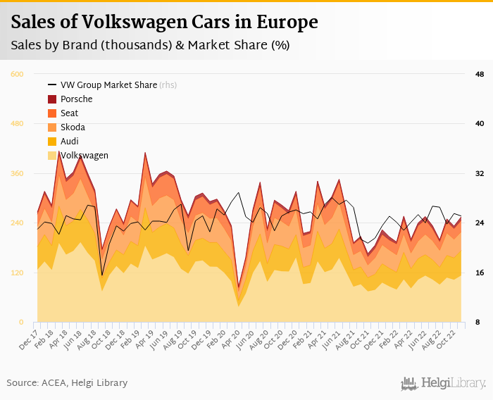 The Group sold 113 thousand of Volkswagen brand cars in November, followed by 60.3 thousand of Audis and 45.3 thousand of Skodas. Seat sold 27.3 thousand vehicles and Porsche some 8.58 thousand cars in November 2022.