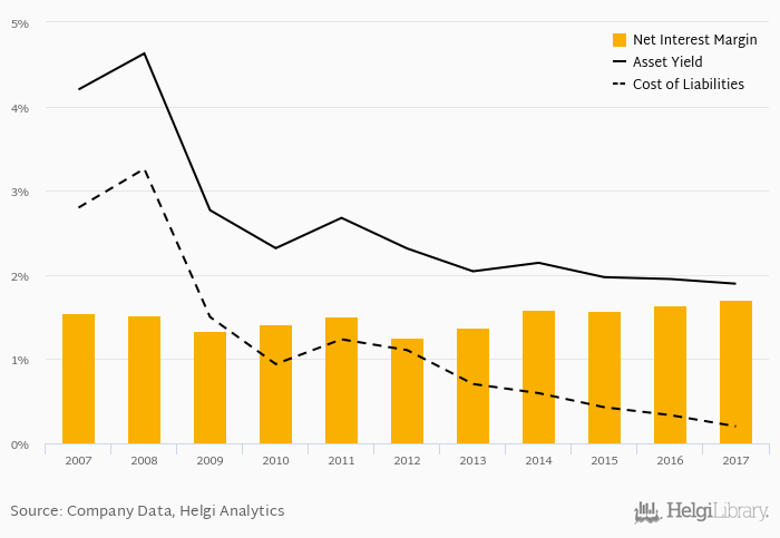 Historically, the bank’s net interest margin reached an all time high of 1.71% in 2017 and an all time low of 1.26% in 2012. The average margin in the last five years amounted to 1.58%.