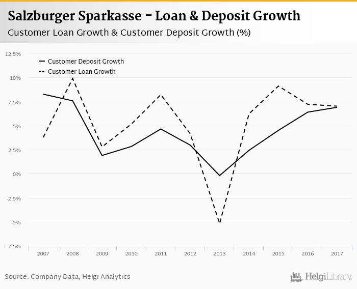 Salzburger Sparkasse's customer loan growth reached 7.01% in 2017, down from 7.21% compared to the previous year. Historically, the bank’s loans growth reached an all time high of 9.89% in 2008 and an all time low of -5.19% in 2013. In the last decade, the average annual loan growth amounted to 5.37%.