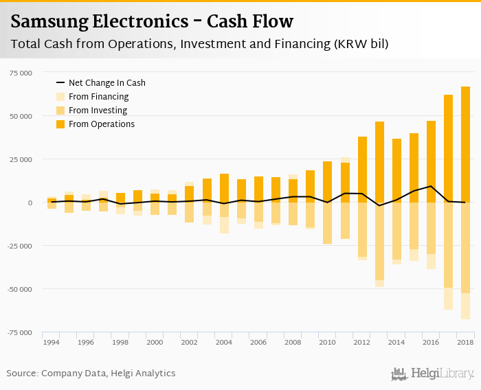 Samsung Electronics's operating cash flow stood at KRW 67,032 bil in 2018, up 7.83% when compared to the previous year. Historically, between 1994 - 2018, the firm’s operating cash flow reached a high of KRW 67,032 bil in 2018 and a low of KRW 1,543 bil in 1996.