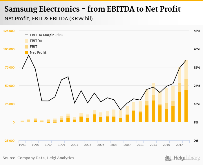 Samsung Electronics made a net profit of KRW 43,891 bil with revenues of KRW 243,771 bil in 2018, up by 6.16% and up by 1.75%, respectively, compared to the previous year. This translates into a net margin of 18.0%.