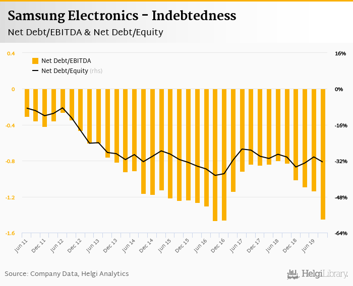 Samsung Electronics's net debt stood at KRW -85,813 bil and accounted for -32.6% of equity at the end of 3Q2019. The ratio is down 2.20 pp compared to the previous year.