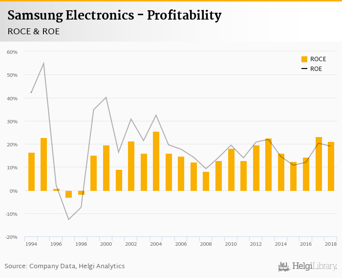As far as Samsung Electronics's peers are concerned, Apple Inc. generated ROE of 49.4% and ROCE of 27.6% in 2018. Huawei's profitability reached 29.0% and 27.1%, respectively. Motorola Solutions operated with -64.3% and 16.5% returns in 2018.