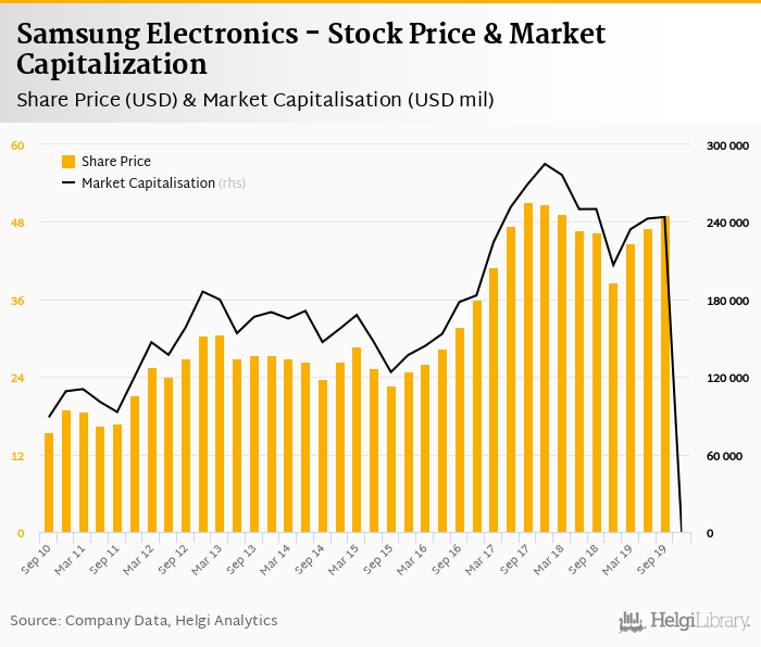 Samsung Electronics stock traded at USD 0 per share at the end 4Q2019 implying a market capitalization of USD 0 mil.
