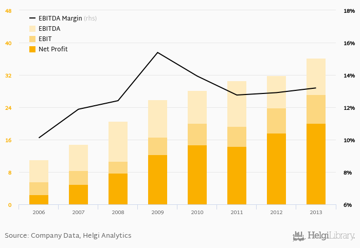 Historically, between 2006 - 2013, the firm’s net profit reached a high of EUR 20.0 mil in 2013 and a low of EUR 2.45 mil in 2006. Since 2008, the firm's net profit has increased 158% or 20.9% a year on average.