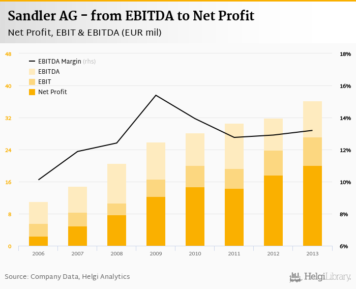 Sandler AG made a net profit of EUR 20.0 mil with revenues of EUR 274 mil in 2013, up by 13.5% and up by 11%, respectively, compared to the previous year. This translates into a net margin of 7.31%.