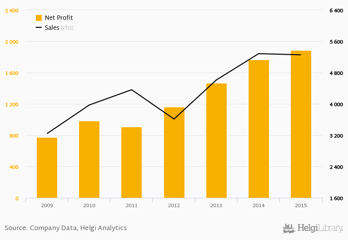 Sales have grown by 5.75% a year on average since 2010. They reached a high of CZK 5,283 mil in 2014 and a low of CZK 3,240 mil in 2009.