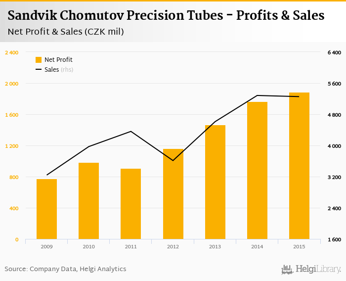 Sandvik Chomutov Precision Tubes made a net profit of CZK 1,885 mil in 2015, up 6.87% compared to the previous year. Total sales reached CZK 5,253 mil, which is down 0.569% when compared to the previous year.