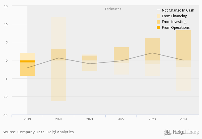 Cash from financing amounted to EUR 2.11 mil, so the company generated EUR -2.10 mil net cash in 2019.