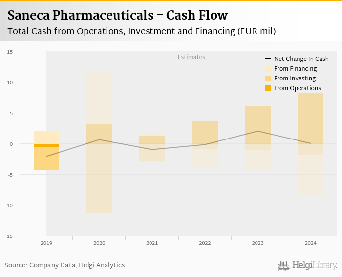 Saneca Pharmaceuticals's operating cash flow stood at EUR -0.519 mil in 2019, up 0% when compared to the previous year. Historically, between 2019 - 2019, the firm’s operating cash flow reached a high of EUR -0.519 mil in 2019 and a low of EUR -0.519 mil in 2019.