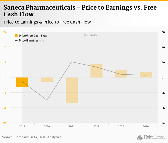 Regarding cash generated defined by the sum of net profit and depreciation, the stock traded at -10.5x at the end of 2019. When investments are excluded to get free cash flow, Saneca Pharmaceuticals traded at -4.82x.