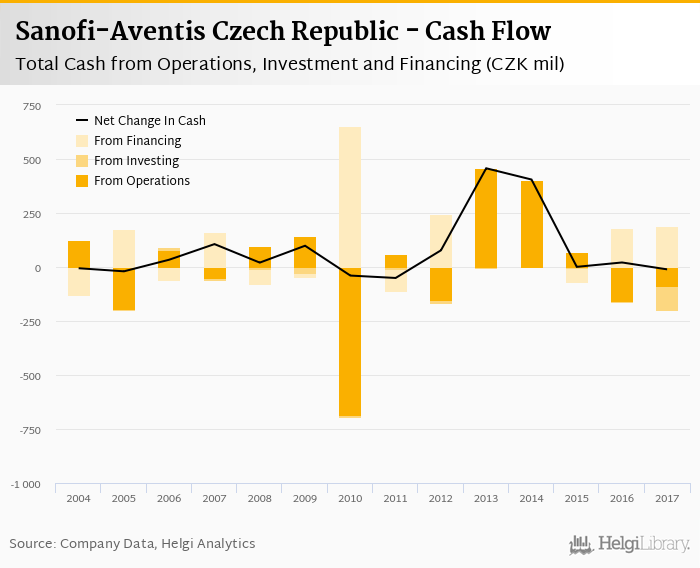 Sanofi-Aventis Czech Republic's operating cash flow stood at CZK -90.1 mil in 2017, up 43.2% when compared to the previous year. Historically, between 2004 - 2017, the firm’s operating cash flow reached a high of CZK 460 mil in 2013 and a low of CZK -685 mil in 2010.
