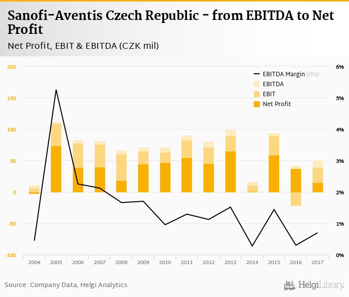 Sanofi-Aventis Czech Republic made a net profit of CZK 15.2 mil with revenues of CZK 7,268 mil in 2017, down by 58.8% and up by 8.47%, respectively, compared to the previous year. This translates into a net margin of 0.210%.