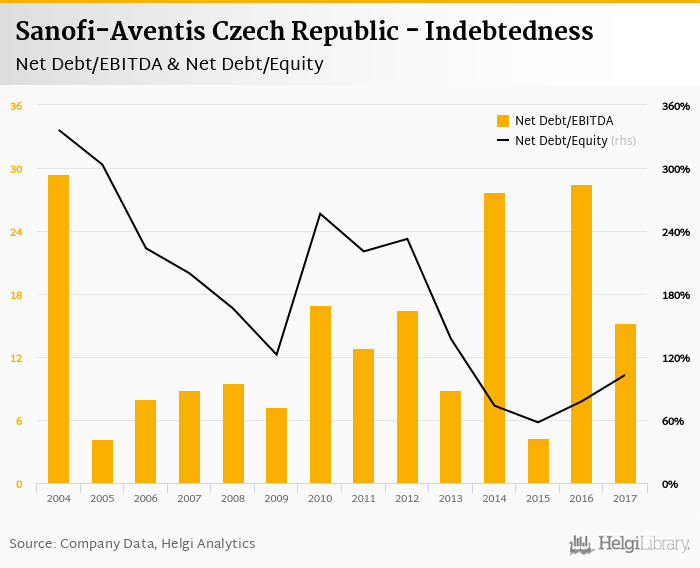 Sanofi-Aventis Czech Republic's net debt stood at CZK 774 mil and accounted for 103% of equity at the end of 2017. The ratio is up 25.2 pp compared to the previous year.