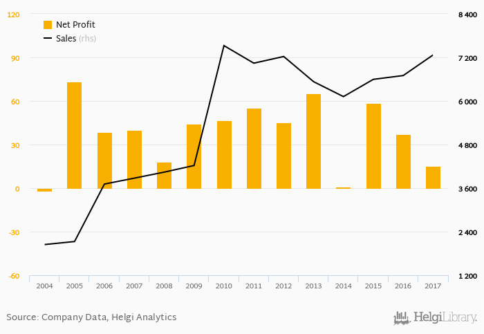 Sales have grown by 6.49% a year on average since 2007. They reached a high of CZK 7,525 mil in 2010 and a low of CZK 2,045 mil in 2004.