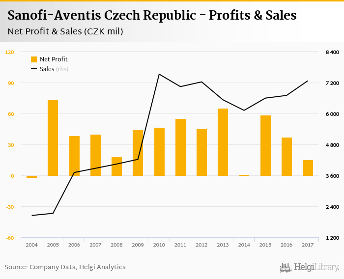 Sanofi-Aventis Czech Republic made a net profit of CZK 15.2 mil in 2017, down 58.8% compared to the previous year. Total sales reached CZK 7,268 mil, which is up 8.47% when compared to the previous year.
