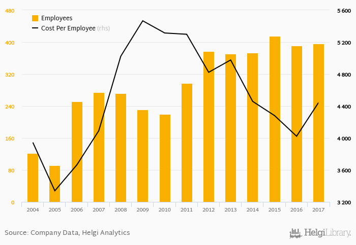 Staff cost represented of sales in 2017, 0 pp higher than a decade ago.