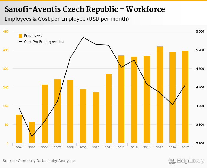 Sanofi-Aventis Czech Republic employed 396 employees in 2017, up 1.28% compared to the previous year. Historically, between 2004 and 2017, the firm's workforce hit a high of 415 employees in 2015 and a low of 91.0 employees in 2005.