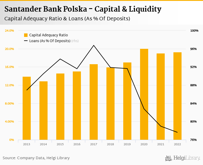 Comparing Santander Bank Polska with its closest peers, PKO BP ended the year 2022 with a capital adequacy ratio at 17.8% and loans to deposits of 68.7%, Pekao with 17.4% and 75.3% respectively and ING Bank Slaski some 15.2% in terms of capital adequacy and 80.5% of loans to deposits at the end of 2022.