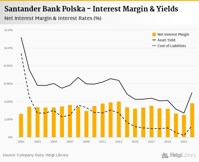 Comparing Santander Bank Polska with its closest peers, PKO BP operated in 2022 with a net interest margin of 2.69% in 2022, Pekao reached 3.10% and ING Bank Slaski some 2.68%.