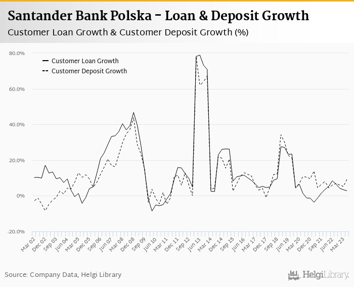 Santander Bank Polska's customer loan growth reached 2.77% in 2023-06-30, down from 8.39% compared to the previous year. Historically, the bank’s loans growth reached an all time high of 78.9% in 2013-06-30 and an all time low of -8.59% in 2010-03-31. In the last decade, the average annual loan growth amounted to 8.44%.