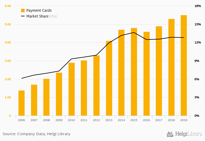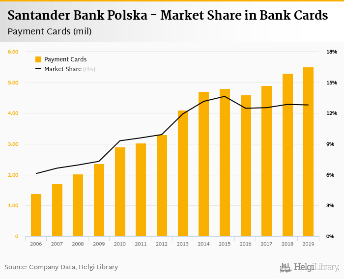 Santander Bank Polska therefore accounted for 12.8% of all bank cards issued by banks in Poland at the end of 2019. Historically, the bank’s market share in payment cards reached an all time high of 13.6% in 2015 and an all time low of 6.11% in 2006.