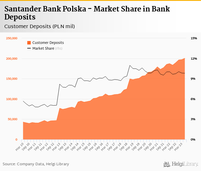 Santander Bank Polska's customer deposits reached PLN 200,656 mil in 2023-06-30, up 1.77% compared to the previous year.