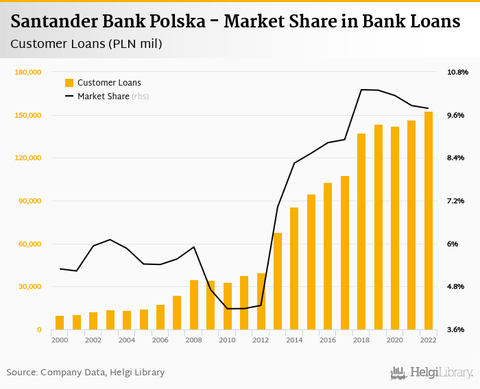 Santander Bank Polska accounted for 9.78% of all customer loans issued in Poland at the end of 2022. Historically, the bank’s market share in customer loans reached an all time high of 10.3% in 2018 and an all time low of 4.18% in 2010.