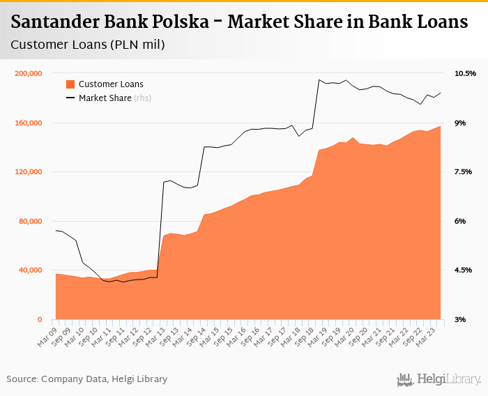 Santander Bank Polska's customer loans reached PLN 156,867 mil in 2023-06-30, up 1.37% compared to the previous year.