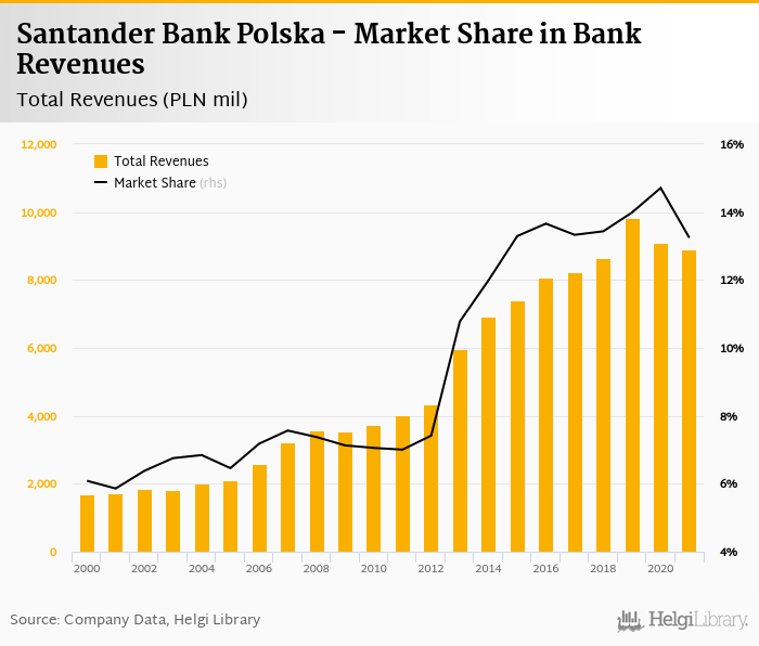 As a result, Santander Bank Polska accounted for 13.2% of all bank revenues generated by banks in Poland in 2021. Historically, the bank’s market share in total revenues reached an all time high of 14.7% in 2020 and an all time low of 5.86% in 2001.