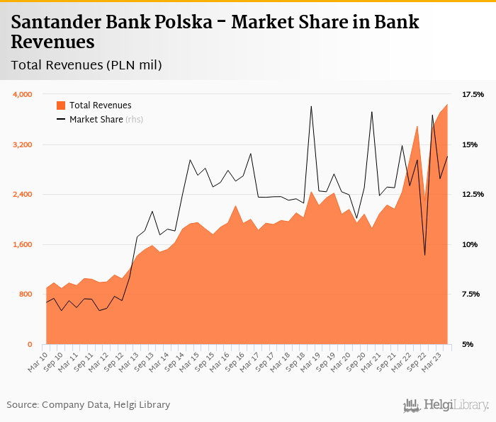 As a result, Santander Bank Polska accounted for 14.4% of all bank revenues generated by banks in Poland in 2023-06-30. Historically, the bank’s market share in total revenues reached an all time high of 16.9% in 2018-12-31 and an all time low of 6.67% in 2010-09-30.