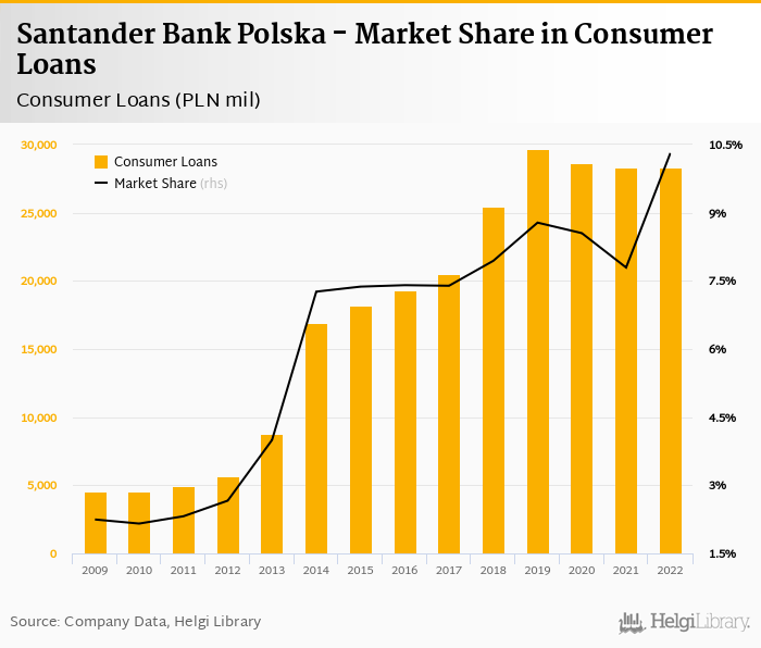 Santander Bank Polska accounted for 10.3% of all consumer loans issued in Poland at the end of 2022. Historically, the bank’s market share in consumer loans reached an all time high of 10.3% in 2022 and an all time low of 2.16% in 2010.