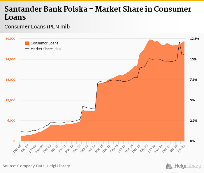 Santander Bank Polska's consumer loans reached PLN 29,328 mil in 2023-06-30, up 2.30% compared to the previous year.