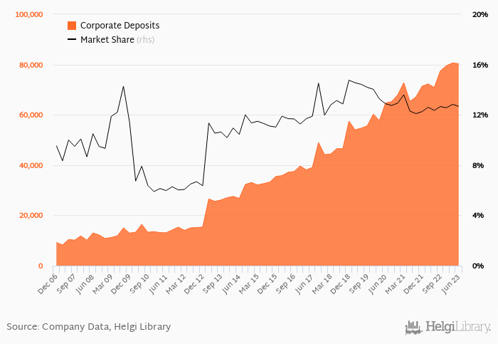 Santander Bank Polska's corporate deposits reached PLN 80,309 mil in 2023-06-30, down 0.402% compared to the previous year.