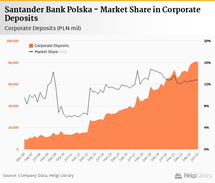 Santander Bank Polska accounted for 12.7% of all corporate deposits taken by banks in Poland at the end of 2023-06-30. Historically, the bank’s market share in corporate deposits reached an all time high of 14.8% in 2018-12-31 and an all time low of 5.90% in 2010-12-31.