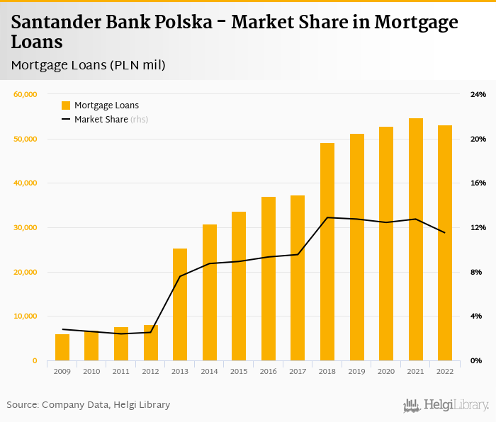 Santander Bank Polska accounted for 11.5% of all mortgage loans issued in Poland at the end of 2022. Historically, the bank’s market share in mortgage loans reached an all time high of 12.9% in 2018 and an all time low of 2.39% in 2011.